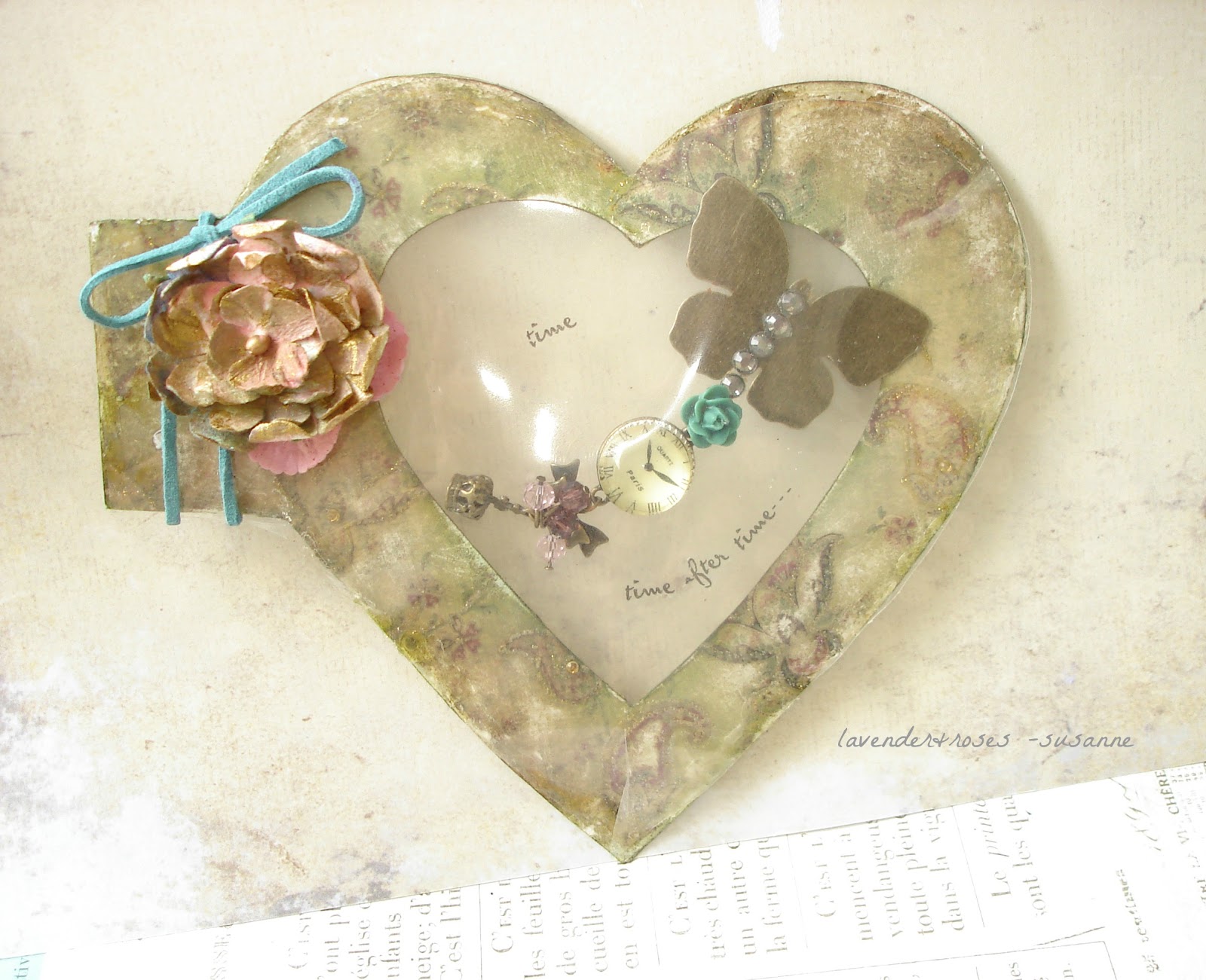 ..if only time would stand still ... For the month of May, our project was to create a heart using aluminum foil, gesso and acrylic paints. I embossed the foil, painted on gesso then polished to reveal the relief of the paisley pattern. I splashed on layers of alcohol inks 'here and there' and embellished with a small amount of stickles.